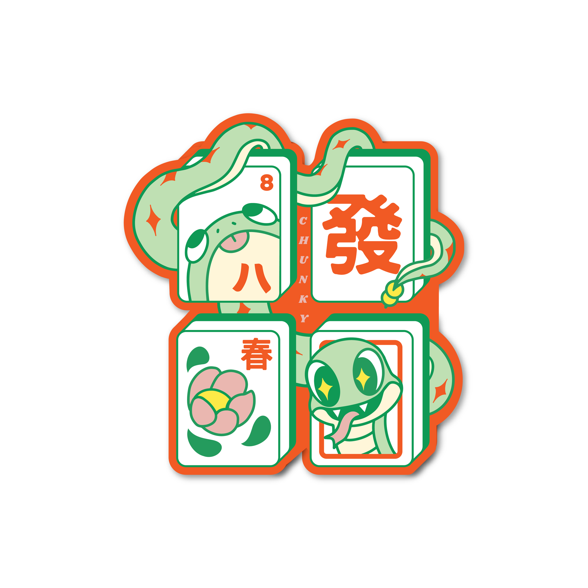 Part of our Year of the Snake Collection! Featuring our mascot of 2025 and lucky mahjong tiles: froggy 8, strike it rich (fa), spring flower (chun), and white tile (bai ban) symbolizing freedom from corruption.